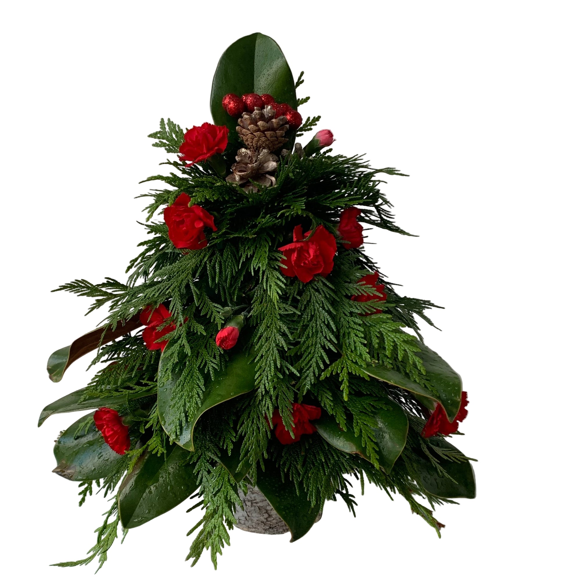 Can you ever have enough Christmas trees? This charming mini arrangement brings festive flair to any tabletop. Crafted with fresh cedar and magnolia, accented with vibrant red spray carnations, it arrives in a rustic birch bark container. Water regularly and enjoy lush greenery through January—swap out the fresh flowers every two weeks to refresh the look and experiment with new color combinations. Standing 16 inches tall, it's the perfect size for desks, shelves, or holiday displays that deserve a living, breathing touch.